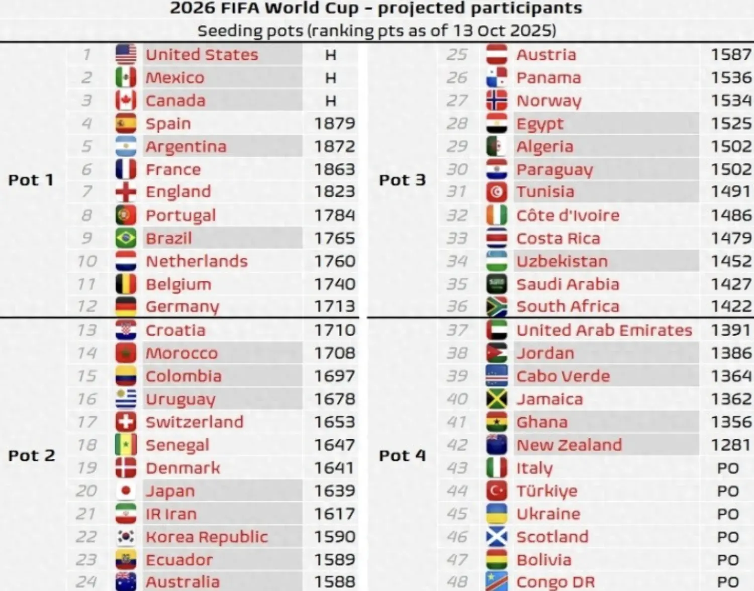 目前世界杯48强已经确定晋级的球队超过一半,数据机构最近按照实时世界排名预测了世界杯分档。美加墨世界杯将分成12个小组,每组4队,也就是有12个种子队。在已经晋级世界杯的球队中,3个东道主美国、墨西哥以及加拿大自动落入第1档。另外阿根廷、巴西以及英格兰都已经出线,按照排名也将进入第1档。